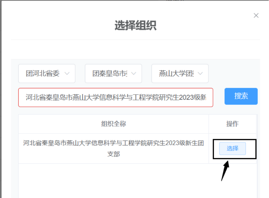 请依次选择“团河北省委”、“团秦皇岛市委”、“PA捕鱼官网入口团委”,并在搜索框中搜索“河北省秦皇岛市PA捕鱼官方网站研究生2023级新生团支部”。之后选择与下图中名字相对应的团支部。