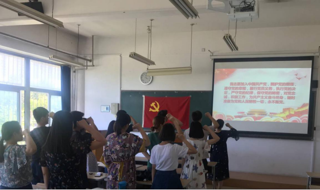 首先,全体起立,奏《国际歌》。随后,党支部书记马晓琼通知宣布到会党员名单。马晓琼、袁梅、郑章琪、张海建、崔思佳、王浩田、焦润涛、王佳炎、冯佳丽、王宏羽、苏咏欣、庒凯、陈盼盼、孟伟伦。同时,支部全体党员面对党旗进行宣誓,由支部书记马晓琼领誓。